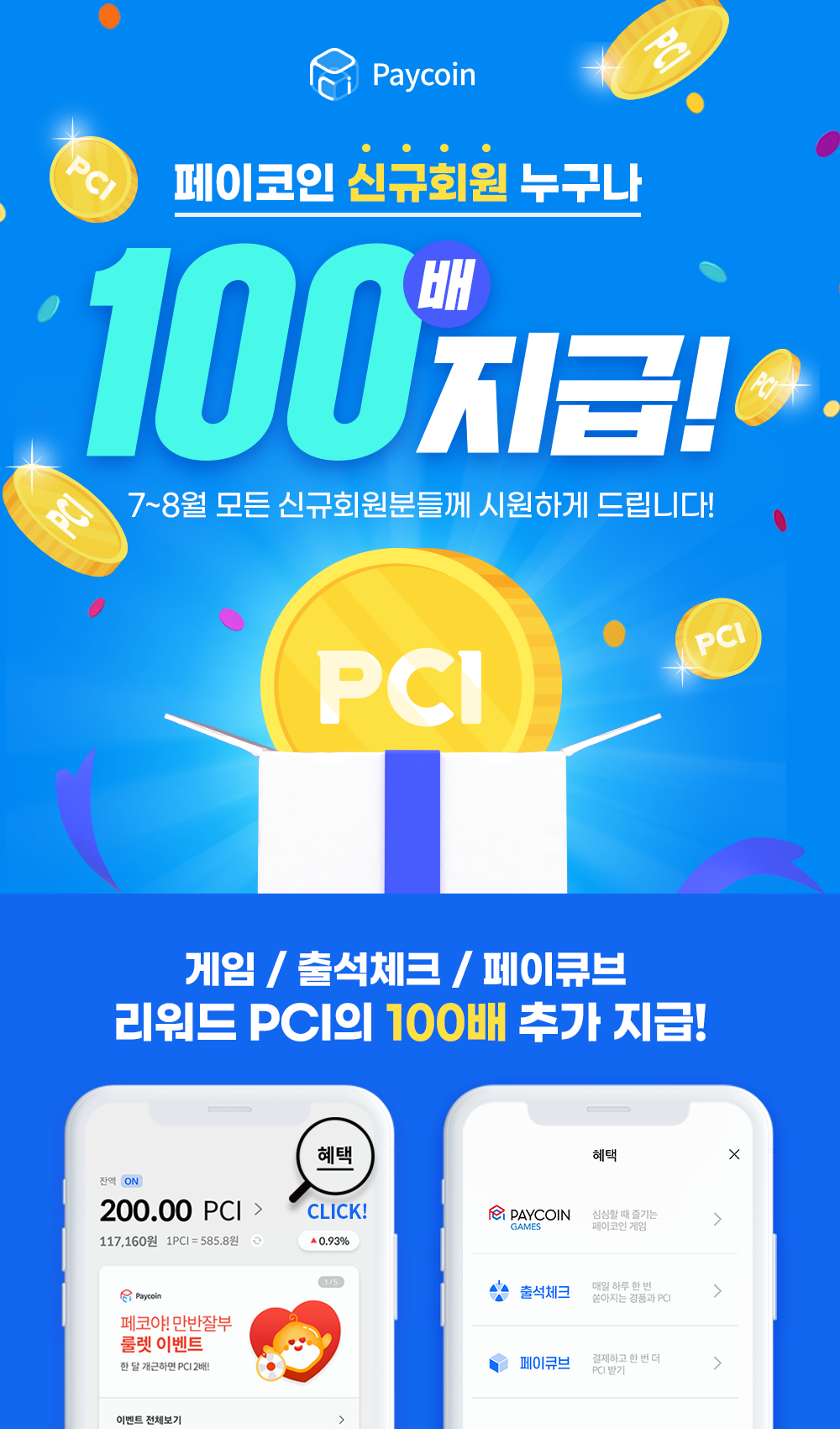 8월에 가입하는 신규회원 누.구.나 페이코인 앱 “혜택” 리워드 PCI x 100배 지급하는 대박 이벤트가 진행중임. 이정도급 이벤트는 거의 처음하는거 같네요. 8월 31일까지니 가입하실 분들은 출석체크 혜택까지 받으려면 서둘러서 참여해야 할 것 같습니다.