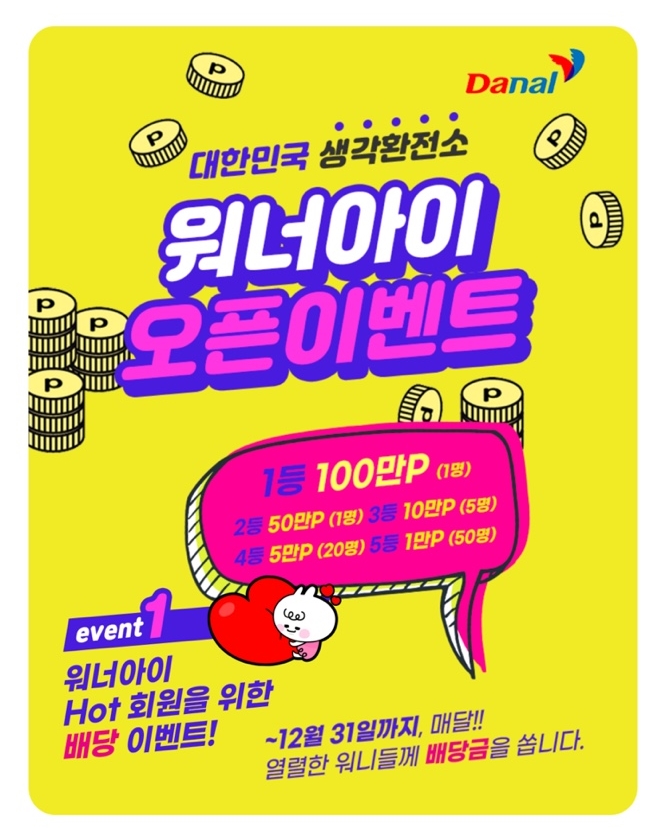 누적 포인트 순으로 300명이상 배당금 지급 (1등 100만원 ~ 5등 50명 1만원)
