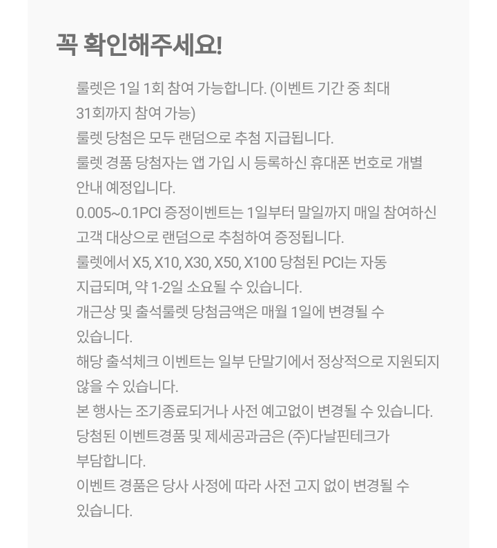 - 경품 : 무조건! 한 달 개근 시 한 달간 본인이 출석체크 이벤트로 당첨된 PCI의 2배 지급